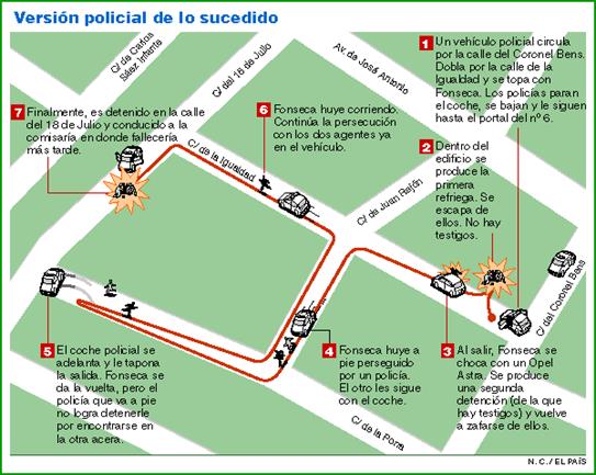 Aquel día, el negro Fonseca, paseaba tranquilamente por la calle DeLa Igualdad cuando fue reducido por las fuerzas del orden. Lejos de amedrantarse ante lo significativo de aquella calle, la policía lo metió en un portal y se produjo una refriega de la que no tenemos conocimiento. Fonseca ¾suponemos¾ trataría de explicarse; argumentaría que él era un ciudadano con residencia legal en España, sacaría a relucir la Carta Magna, la Declaración de los Derechos del Hombre y todas las demás igualdades que nos asisten en un Estado democrático. Pero al parecer Fonseca no resultó convincente y por eso al zafarse de los guardias huyó calle abajo. Acosado por sus captores tuvo la mala fortuna de iniciar la huida por la calle De la Porra. Sin duda, aquel no era un buen sitio para huir estando bajo la amenazadora sombra de los agentes y del peso de aquella inquietante calle. Por eso Fonseca decidió recortar su carrera y desandar de nuevo los pasos. Un hombre como él, acostumbrado a dar explicaciones hasta por su sola presencia en el mundo, estaba mejor dotado que sus perseguidores, así que reinició la huida por la calle De La Igualdad. Pero evidentemente Fonseca nunca fue un hombre afortunado, porque al llegar a la Avenida de lo que él creía era la Gran Avenida de la Libertad, giró a la izquierda en una vieja y angosta calle: la Del 18 de Julio. No sabemos lo que le hubiera deparado el futuro si al llegar a esa calle hubiera girado a la derecha, pero en su alocada carrera Fonseca, agobiado, exhausto e imprudente tuvo la osadía de girar a la izquierda en aquel oscuro callejón del pasado. Si al menos el hostigamiento hubiera tenido lugar en París, durante el 18 del Brumario, tal vez hubiera tenido alguna oportunidad, pero no, sucedió en Canarias, en verano, casi al final del segundo milenio, durante la mayor oleada de inmigrantes registrada en la Historia, en la calle Del 18 de Julio. Era, por tanto, éste, un final previsible.